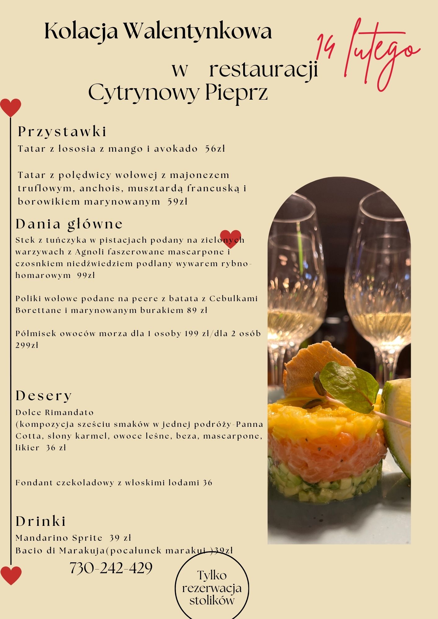 Przyjdźcie do Cytrynowego Pieprzu i uczcijcie Walentynki w wyjątkowy sposób! Zanurzcie się w atmosferze miłości i smaków, które pozostaną w Waszej pamięci na zawsze. Zarezerwujcie teraz stolik na naszą niezwykłą kolację walentynkową, gdzie każdy kęs to uczta dla zmysłów. Doświadczcie kulinarnej magii i stwórzcie wspomnienia pełne smaku i bliskości. Niech to będzie niezapomniana noc – zarezerwujcie już dziś!
