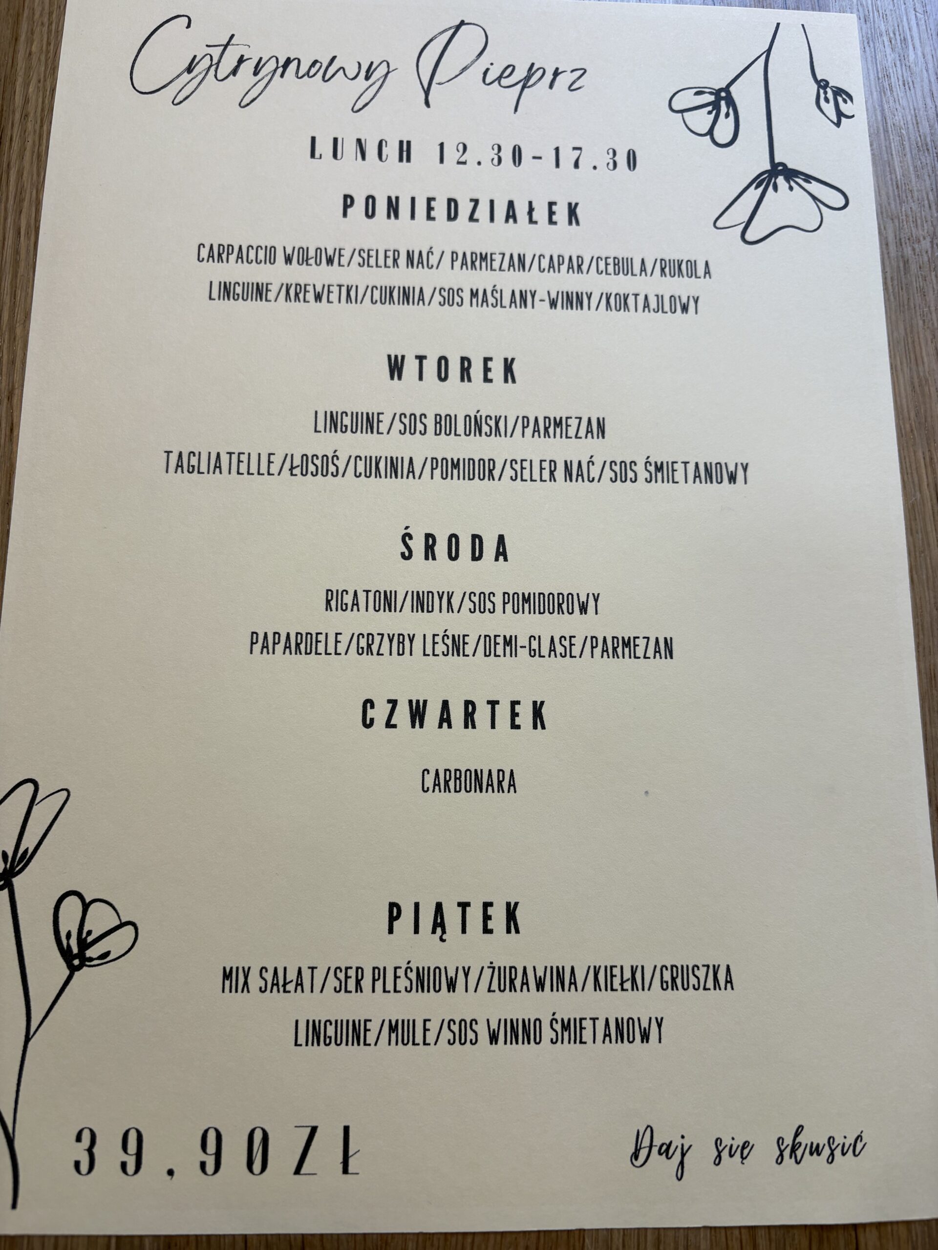 Od poniedziałku do piątku w godzinach 12.30-17.30 zapraszamy na codzienną ofertę lunchową.